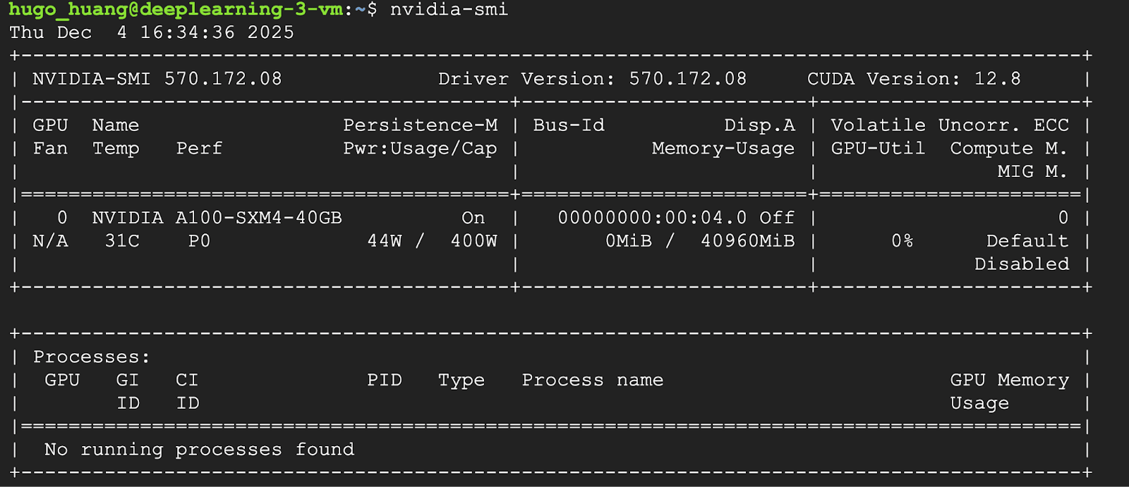 You should see a table listing your GPU (e.g., A100) and the CUDA version.